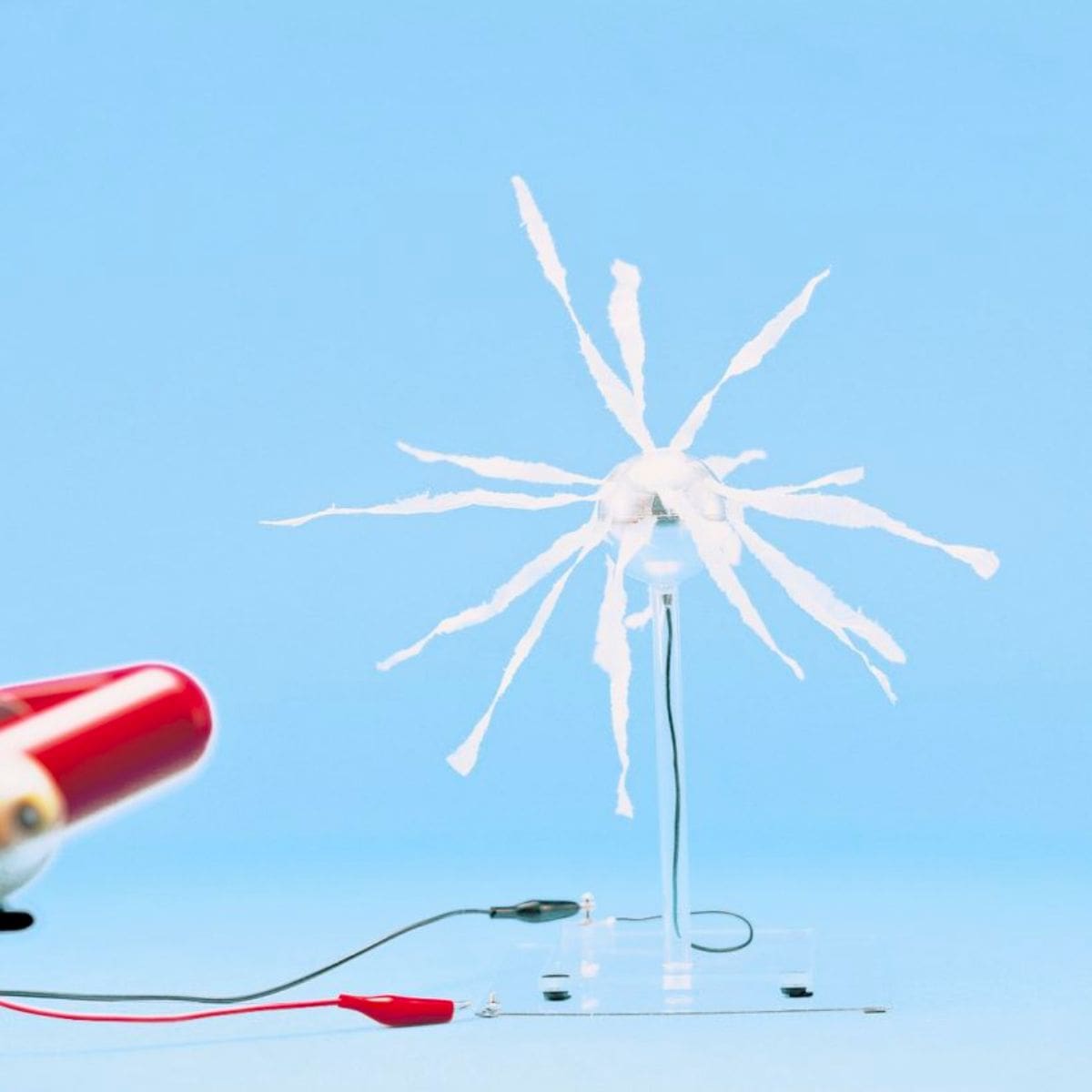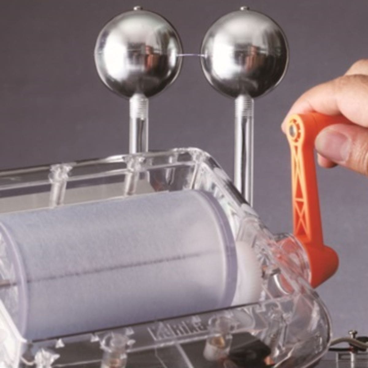 Permite realizar experimentos reales de descarga electrostática, atracción y repulsión de cargas, incluyendo la visible chispa eléctrica entre dos esferas.