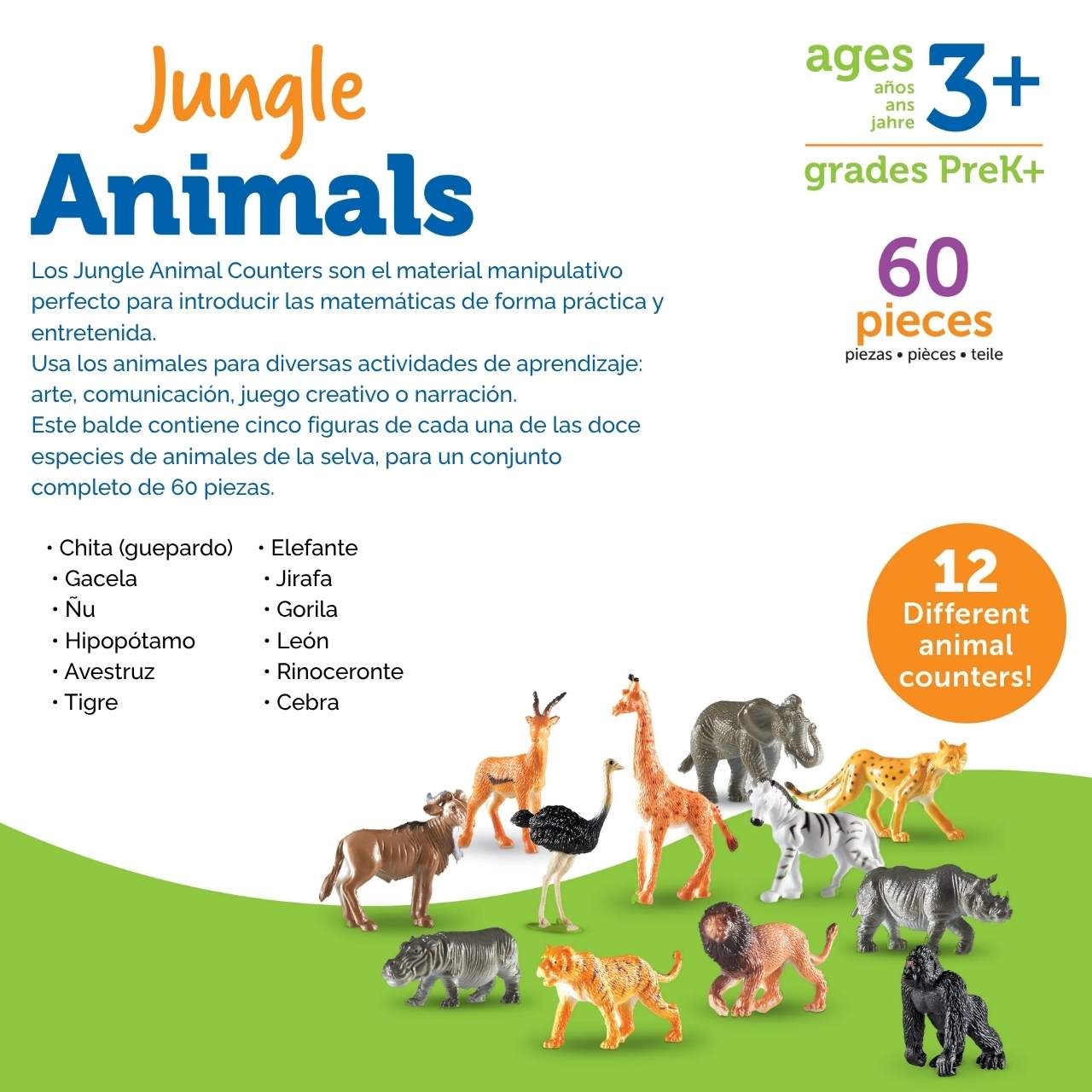 El conjunto Jungle Animal Counters – 60 piezas de Learning Resources® ofrece una experiencia de aprendizaje manipulativo para que niños y niñas descubran la fauna de la jungla mientras desarrollan habilidades de conteo, clasificación y razonamiento lógico.