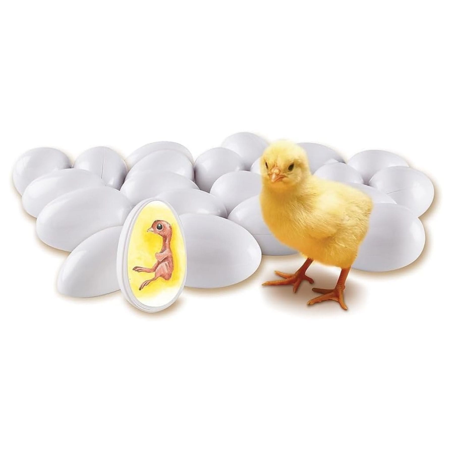 Incluye 21 huevos numerados que muestran cada etapa del crecimiento, más figura final 3D.