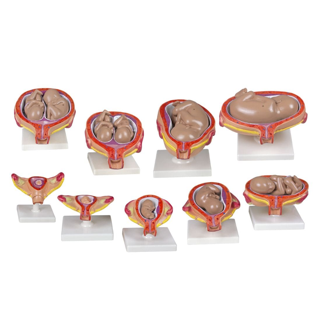 Cada modelo presenta detalles anatómicos precisos y colores diferenciados para facilitar la comprensión de estructuras clave según el avance del embarazo.