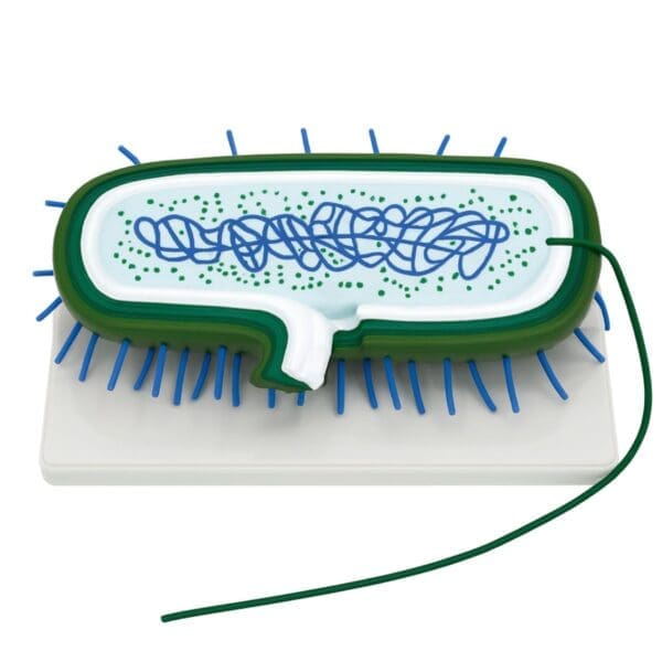 Modelo didáctico de la bacteria Escherichia coli, mostrando con claridad su ADN, membranas, pili y flagelos. Ideal para clases de microbiología y biología celular.