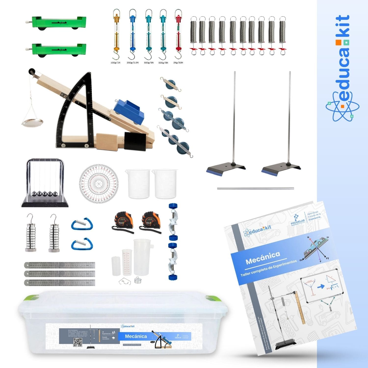 Demuestra la teoría con nuestro MecanoKit. Este completo kit educativo aborda 9 experimentos prácticos sobre temas como fuerzas, poleas, plano inclinado, dinámica de movimiento, péndulo de Newton, choques inelastico y elástico, empuje, flotabilidad y más.