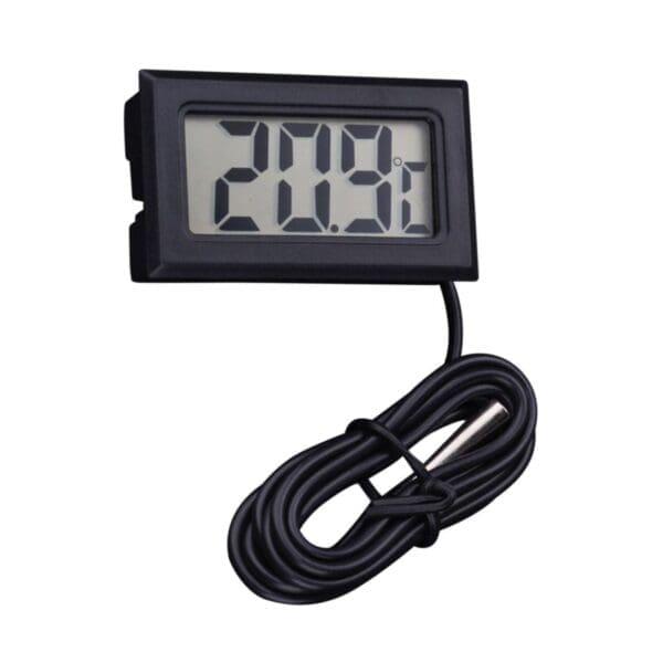 Termómetro digital con cable sensor externo, ideal para uso escolar y de laboratorio. Permite medir la temperatura ambiente o de superficies con alta precisión.