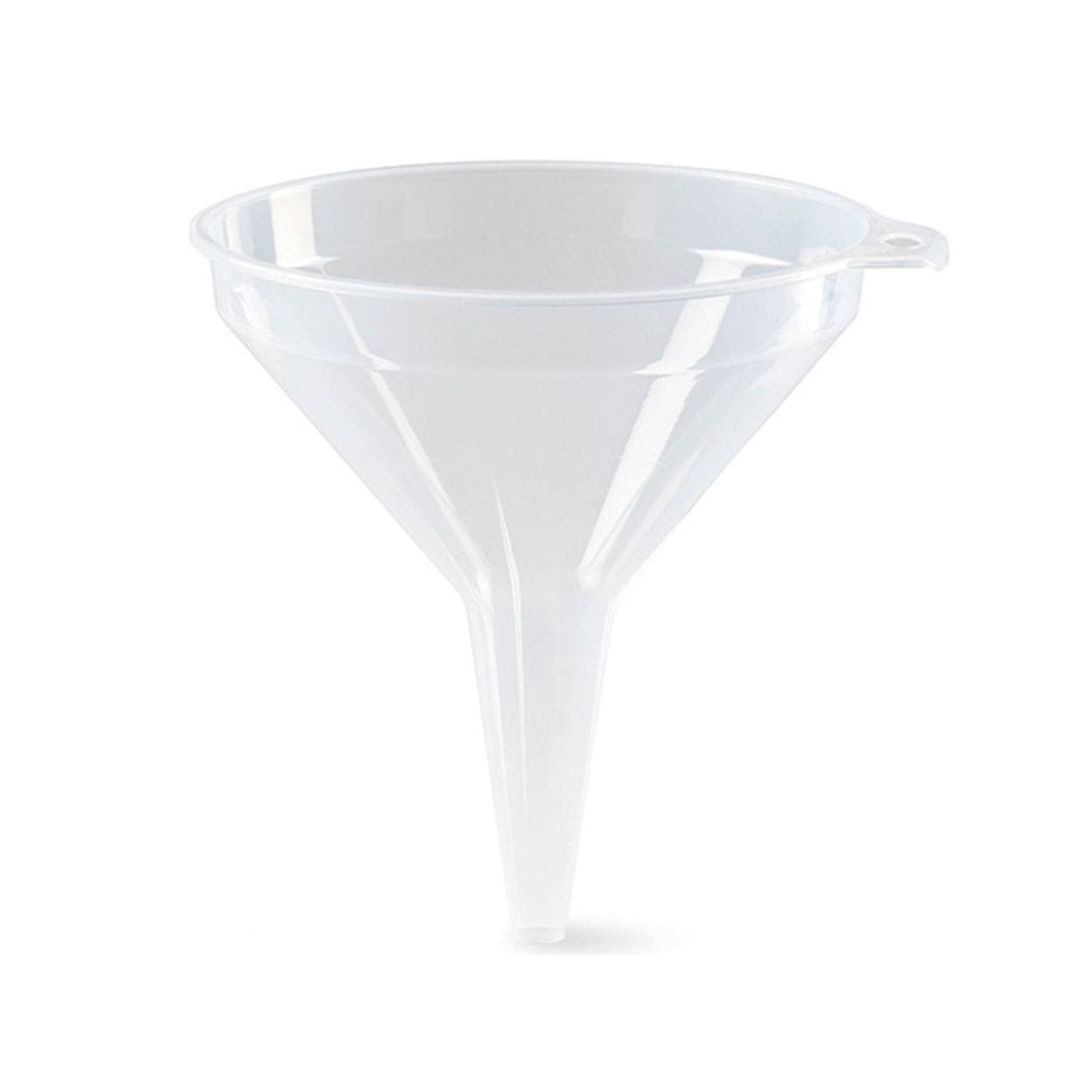 Embudo de Polipropileno (PP) de 100 mm con vástago (tallo) corto. Ideal para trasvase en frascos de cuello bajo y filtración sencilla.